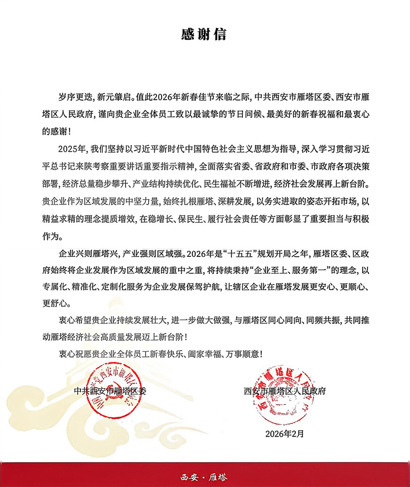 雁塔区委、区政府的感谢信已收到,这不仅是一份温暖的节日问候,是对我们过去一年努力的认可,更是对未来继续奋进的期许。